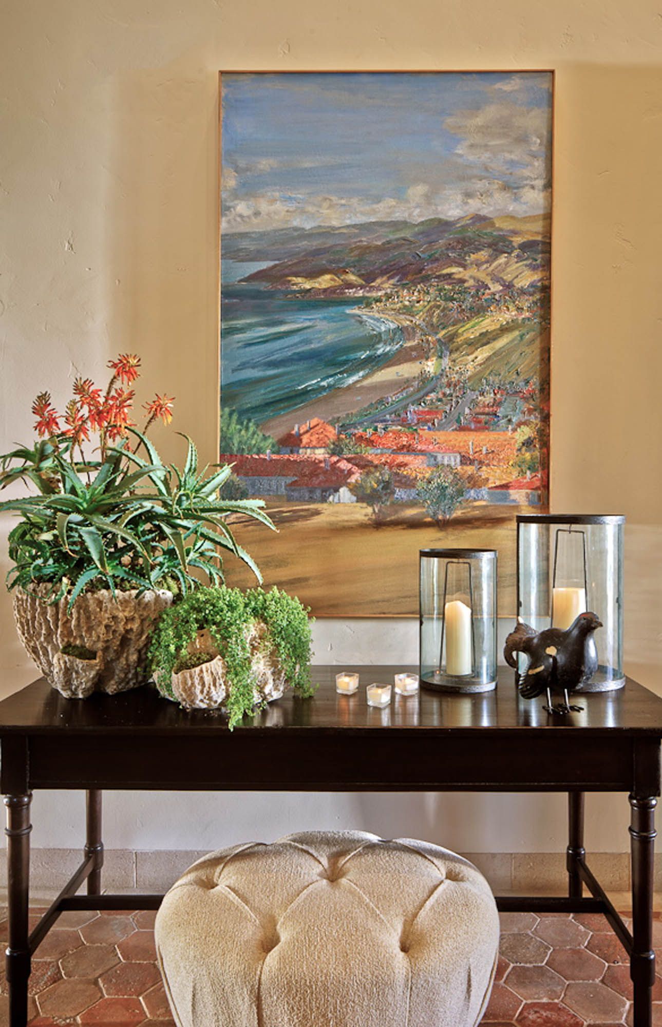 Set in the prestigious Palisades Riviera, this Mediterranean estate was thoughtfully reimagined by Everage Design to honor its architectural heritage while elevating it for modern family living. Light-filled, cozy, yet durable, the home is a sanctuary for carefree living, perfectly suited for a growing young family and their beloved pups. A soft, tonal texture program - featuring luxe indoor/outdoor washable chenilles and linens - complements the rich, timeworn beauty of aged limestone, terracotta, and walnut. Expansive yet intimate, the home seamlessly blend Old World charm with contemporary comfort, from the grand chef's kitchen and richly appointed family room, the sun-drenched living spaces open to lush gardens and a tranquil pool, outdoor kitchen, and lounge.
