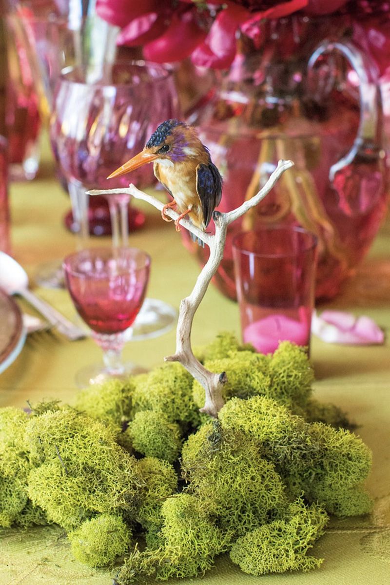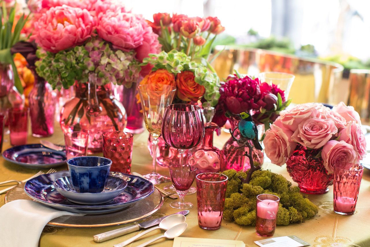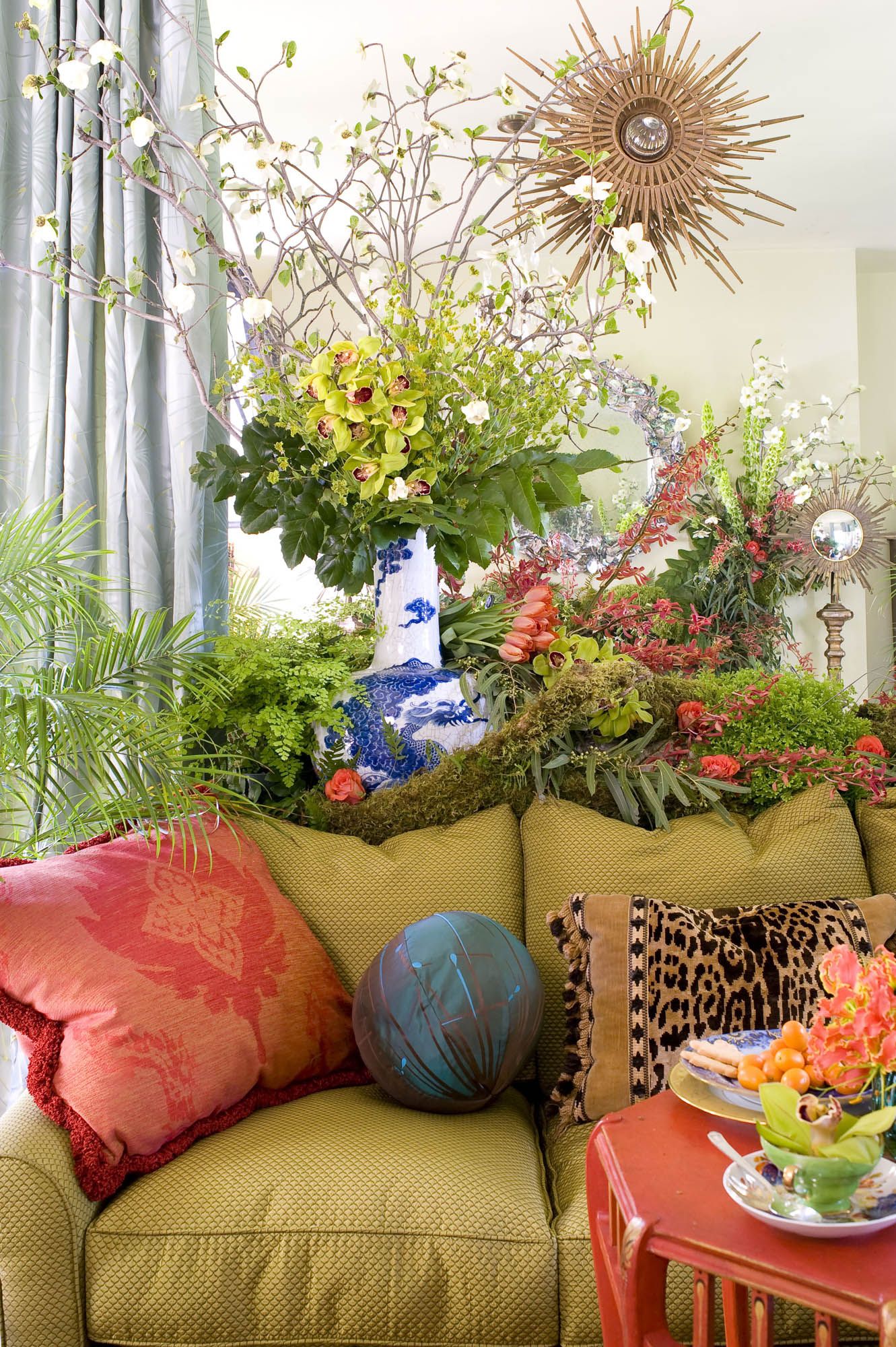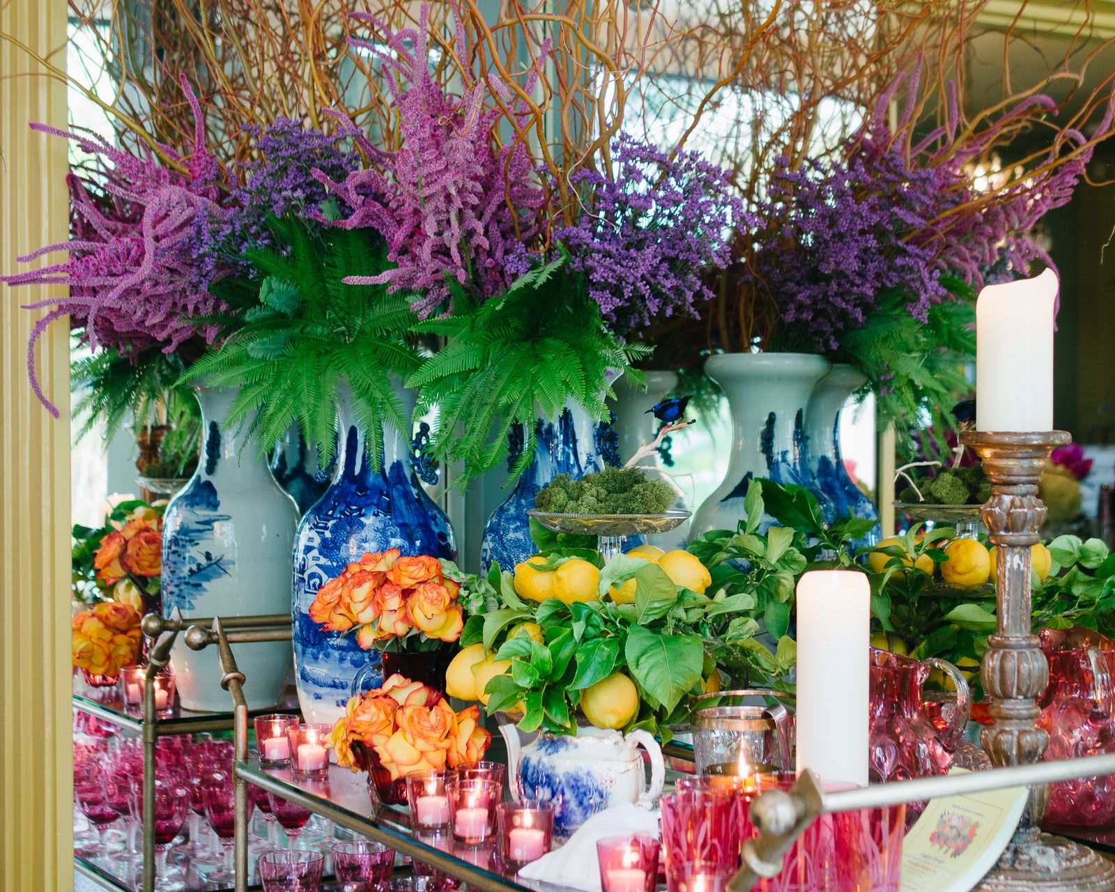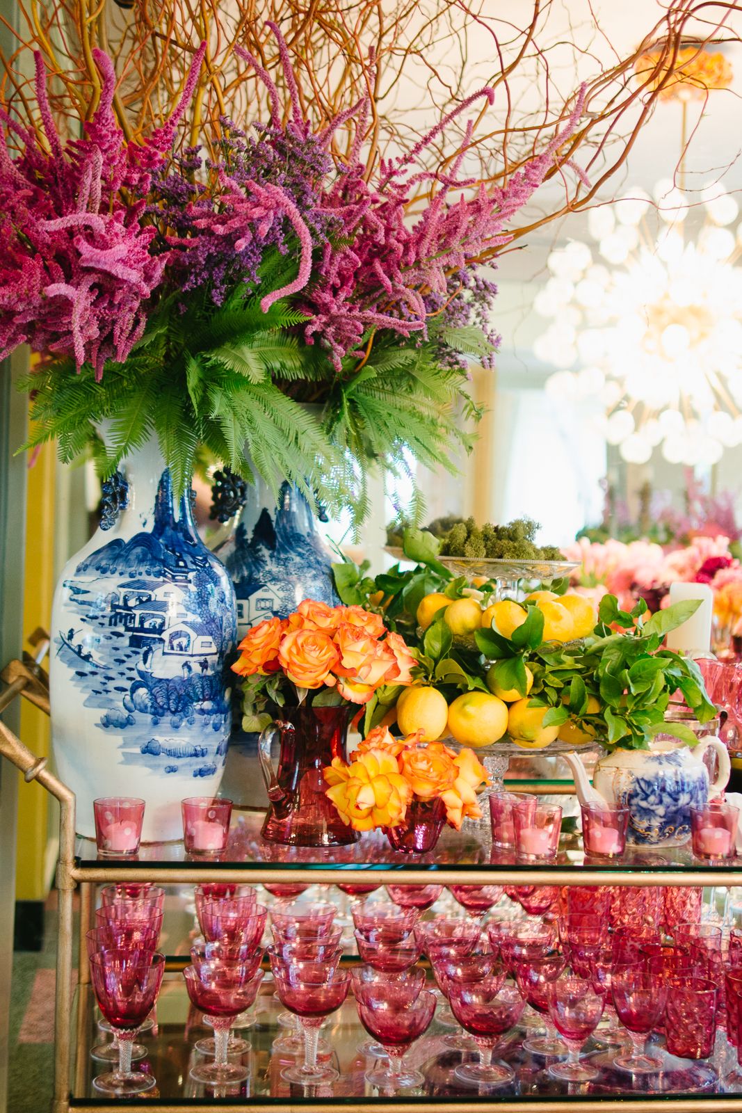 And for a spring time luncheon in the open-air loggia, the Everage team conjured a lush and layered garden lunch table with the bespoke brass bar cart. Antique English cranberry glassware glows with 1830’s flow blue china, contrasted with the shimmering midcentury Italian sunburst chandelier and brass klismos chairs.