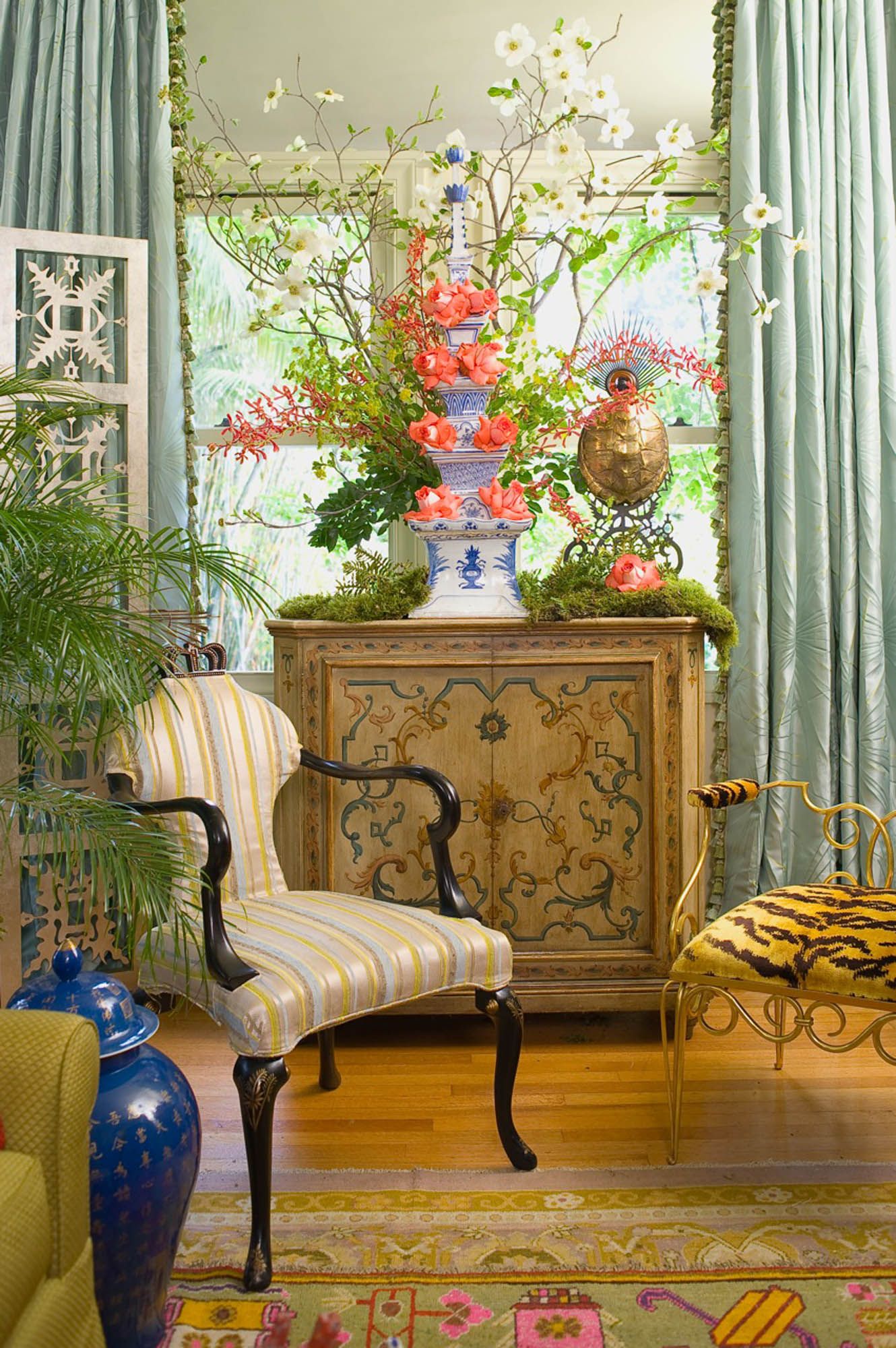 As an homage to Virginia Robinson’s dear friend, the visionary Tony Duquette, the Everages curated Virginia’s morning room as an enchanted indoor garden tea room in the manner of Tony’s style.